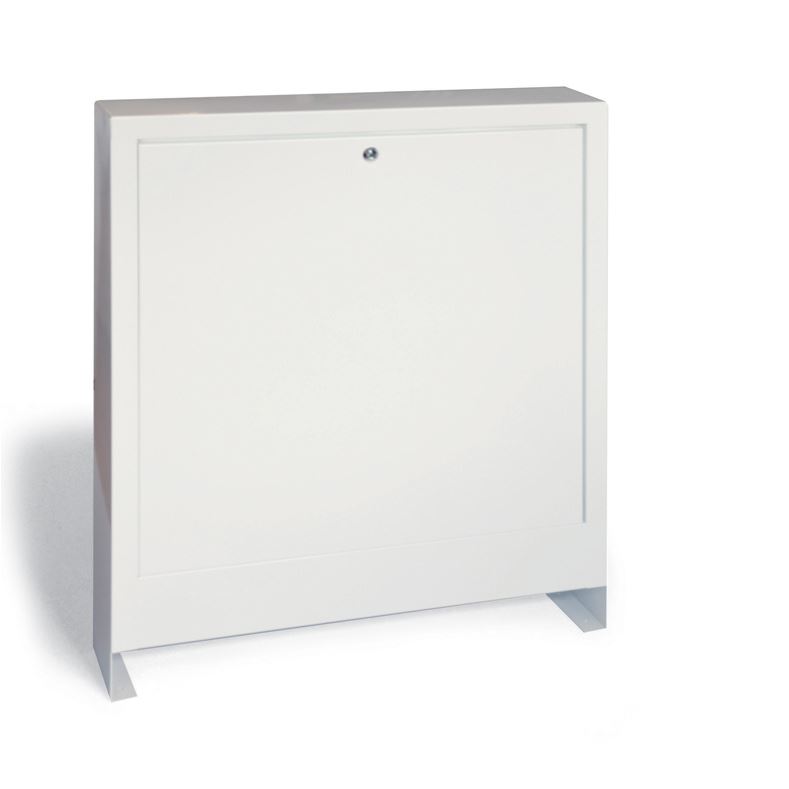 Skříňka pro předstěnovou montáž rozdělovací stanice z pozinkovaného plechu. Hloubka 130mm, šířka 600 mm, výška 730 mm od hrubé podlahy, s posuvnými lištami pro upevnění rozdělovací stanice. Povrch je lakovaný práškovou barvou (RAL 9010). Dvířka se zabudov