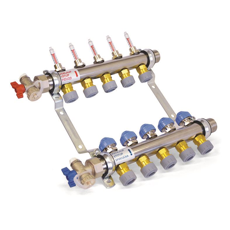 Rozdělovač pro podlahové vytápění (nerez) s násuvnými spojkami pro trubky 15 × 1,5 mm