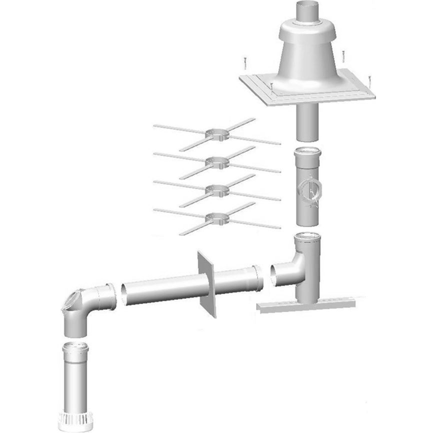 obsahuje: revizní koleno 87°/ DN 80 na připojení na kotel, trubku DN 80 délky 500 mm, rozetu, oopĚrné koleno 87° podpěrou, revizní trubku, 4 distanční držáky, plastový kryt šachty s integrovaným vedením spalin a vzduchu. Vyhotovení závislé na vzduchu z mí