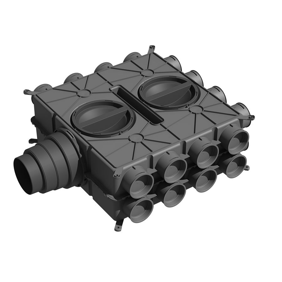 pro přívod nebo odvod vzduchu, 24 hrdel DN 75 se 12 zátkami, pro připojky s kruhovým/plochým průřezem DN63, 500x100 a 50x140 je pro připojení nutný adaptér. Pro rozměr 50x140 je možné použít max. 18 připojení.