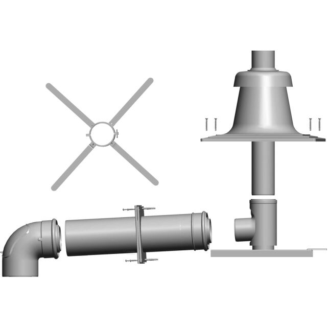 obsahuje: revizní koleno 87° na připojení na kotel, trubku DN 60/100 délky 500 mm, rozetu, opěrné koleno 87°s podpěrou, 4 distanční držáky, antikorový kryt šachty s integrovaným vedením spalin a vzduchu. Vyhotovení nezávislé na vzduchu v místě instalace