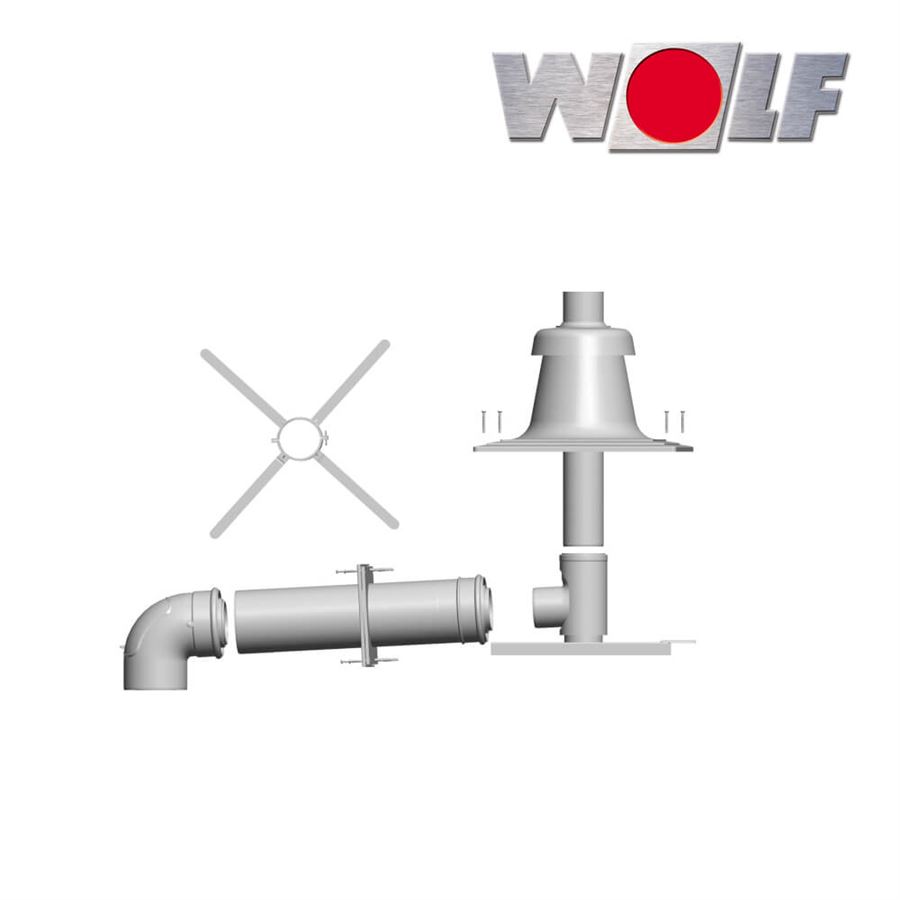 obsahuje: revizní koleno 87° na připojení na kotel, trubku DN 60/100 délky 500 mm, rozetu, opěrné koleno 87°s podpěrou, 4 distanční držáky, plastový kryt šachty s integrovaným vedením spalin a vzduchu. Vyhotovení nezávislé na vzduchu v místě instalace