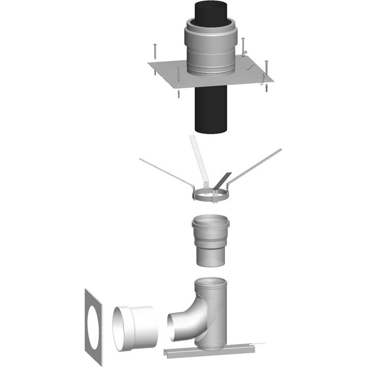 pro připojení kaskády kotlů, obsahuje: kryt šachty DN 110 včetne trubky vyústění, 6 distančních držáků DN 110, opěrné koleno 87° DN 110 s podpěrou /místo podpěry se na podepření může použít spalinová trubka příslušné délky/, přechod stěnou DN 110/160, ro
