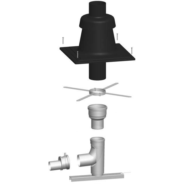 obsahuje: kryt šachty kompl. DN 125 včetne trubky vyústění, 6 distančních držáků DN 125, rozšíření DN 80 na DN 125, opěrné koleno DN 60-DN 80 s podpěrou /místo podpěry se na podepření může použít spalinová trubka příslušné délky/. Vyhotovení nezávislé na